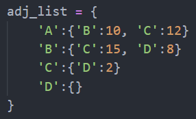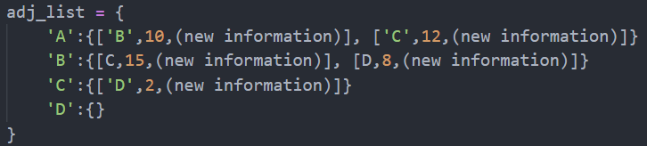 What I did here in my implementation is that if I where to add an edge (which consists of a source, target, and this case its weight), I would use a list as a pair or even a dictionary in this case. In the exercise, I mapped the key-value pair, with the key as the source pair as a dictionary which composed of target and its weight. However I can use a list for the pair like in the photo below. We also use just purely list in this graph but using dictionaries in python is more efficient.